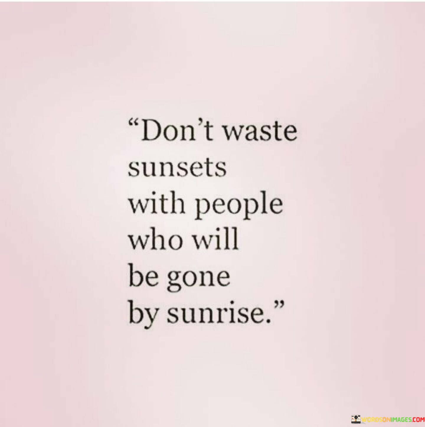 "Don't waste sunsets with people who will be gone by sunrise" is a quote that carries a poignant message about the value of investing time and energy in meaningful relationships and experiences. It reminds us to prioritize connections that are genuine, lasting, and enriching, and to be mindful of how we choose to spend our time.