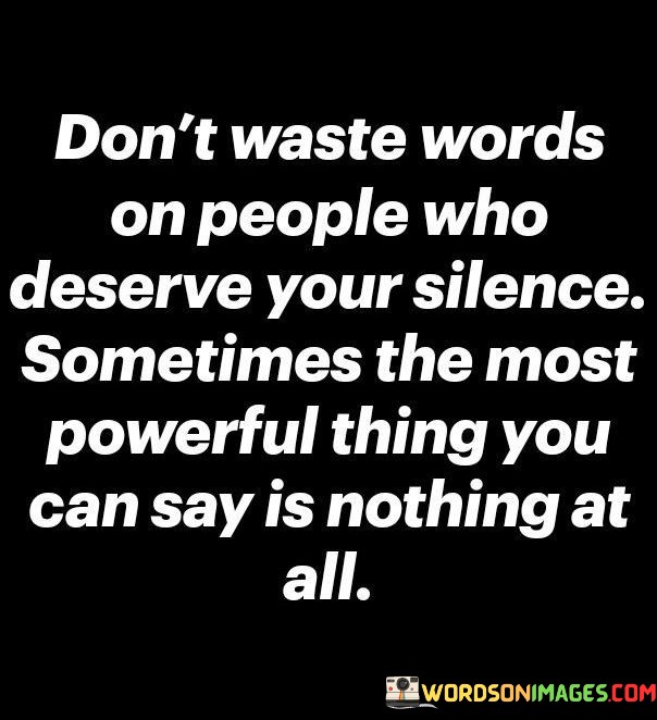 The quote emphasizes the idea of selective communication. It suggests that some individuals are not worth engaging with verbally and that silence can be a potent response. This viewpoint underscores the notion that withholding words from those who don't merit them is a strategic choice.