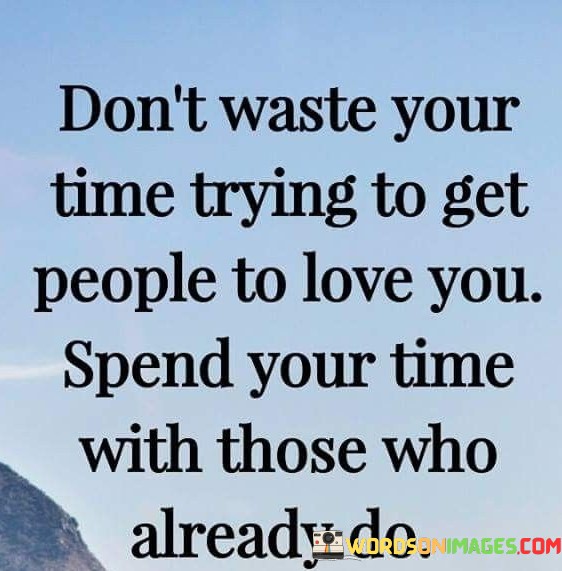 The statement advises against seeking validation from those who don't appreciate you. It suggests that focusing on spending time with people who already love and value you is more rewarding. By highlighting the importance of surrounding oneself with supportive individuals, the statement underscores the significance of nurturing existing relationships.