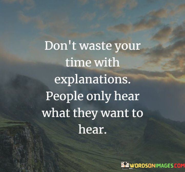 In the first paragraph, this quote advises against investing time in providing explanations. It suggests that people's receptivity is selective, and they often hear what aligns with their preconceptions. By advocating for discernment in communication, the quote emphasizes the limitations of trying to make others understand.