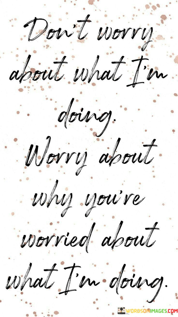 The quote "Don't worry about what I'm doing, worry about why you're worried about what I'm doing" challenges the observer's perspective. It prompts introspection, inviting individuals to examine their motivations for focusing on others. Instead of fixating on external actions, one should reflect on their own intentions and priorities, fostering self-awareness.