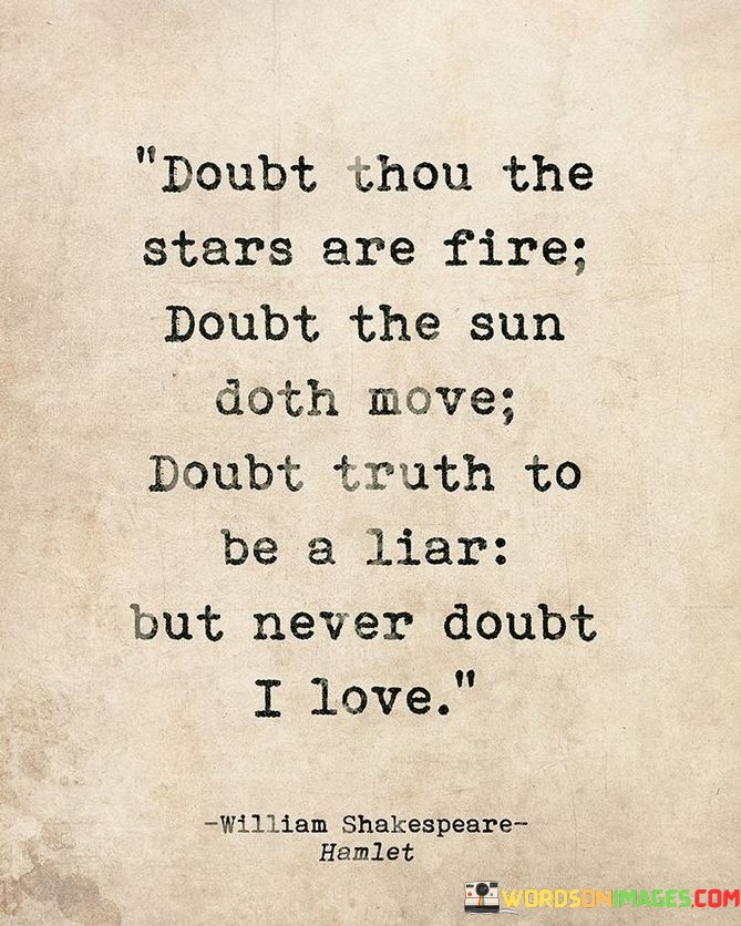 The lines are part of a passionate affirmation of love, asserting that even in the face of uncertainty and doubt about the nature of celestial bodies, the constancy of truth, and the reliability of the universe's order, one thing remains steadfast: the speaker's love. The quote beautifully juxtaposes the vastness of cosmic elements with the intensity and certainty of the speaker's affection.