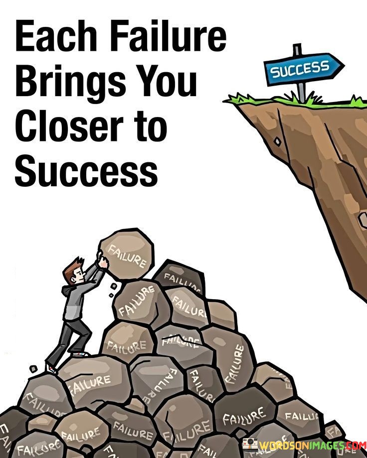 The quote "Each failure brings you closer to success" emphasizes the notion that setbacks and failures are integral parts of the journey toward success. It suggests that learning from mistakes and adapting after failures contribute to eventual achievements.