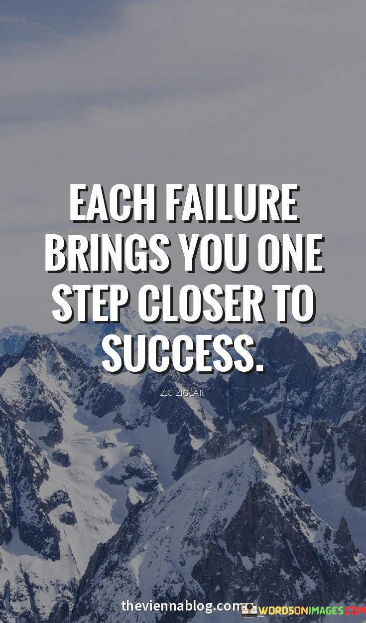 The quote portrays failure as a catalyst for progress. It implies that setbacks are not permanent obstacles but rather integral parts of the journey. With each failure, individuals gain insights, refine strategies, and build resilience, ultimately inching closer to their goals.