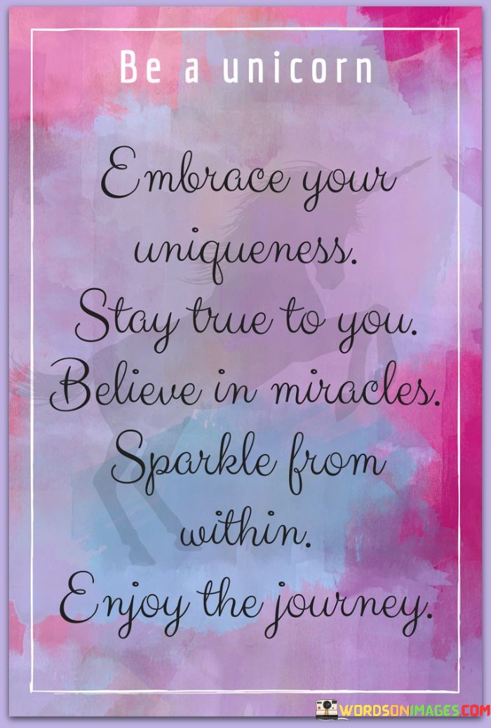 In essence, the quote embodies a message of self-empowerment. "Embrace Your Uniqueness" prompts self-appreciation. "Believe Miracles Sparkle From Within" encourages optimism. "Enjoy The Journey" symbolizes the beauty of personal development and the fulfillment found in remaining true to oneself.