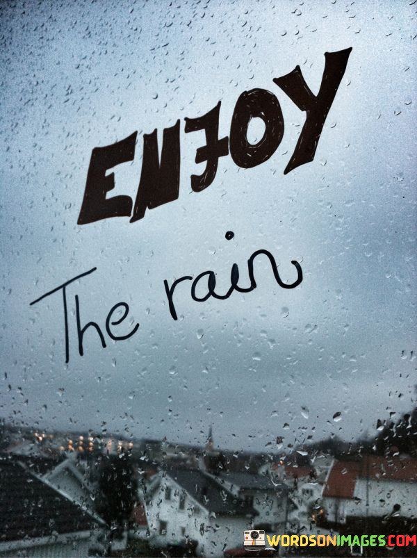 The quote underscores the importance of mindfulness. It suggests taking a moment to appreciate the present, even in the midst of inclement weather. "Enjoy the rain" signifies finding happiness in the small and often overlooked moments in life.