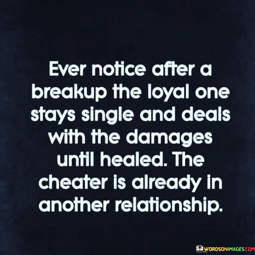 The quote, "Ever Notice After a Breakup, the Loyal One Stays Single and Deals with the Damages Until Healed, the Cheater Is Already in Another Relationship," captures the disparity in how individuals cope after a split. It underscores the different approaches to healing and moving forward.