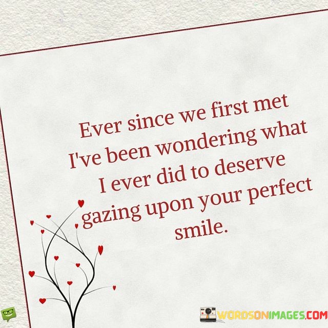 "I've been wondering what I ever did to deserve gazing upon your perfect smile" emphasizes the speaker's sense of appreciation and amazement at the person's captivating smile.