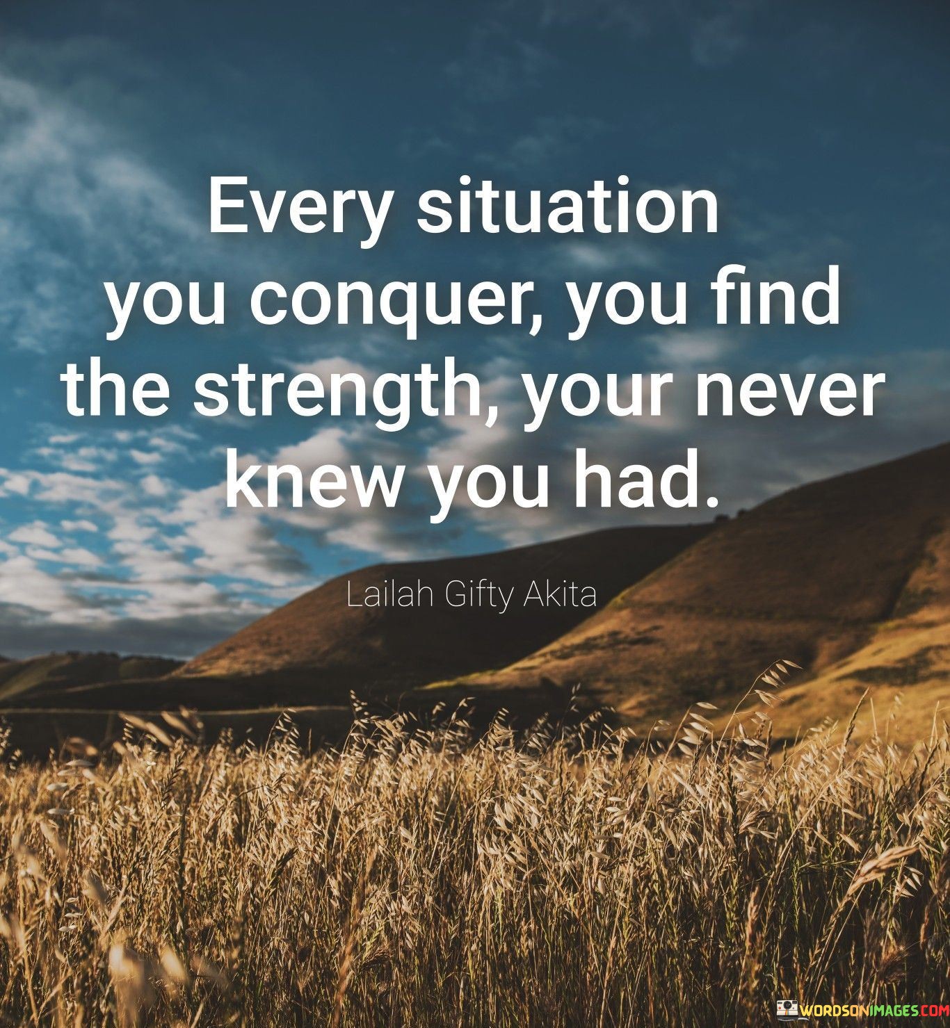 The quote "Every situation you conquer, you find the strength you never knew you had" illustrates the transformative nature of challenges. Overcoming difficulties reveals untapped reservoirs of inner strength. Each triumph contributes to personal growth, fostering resilience, confidence, and a deeper understanding of one's capabilities, nurturing self-discovery.