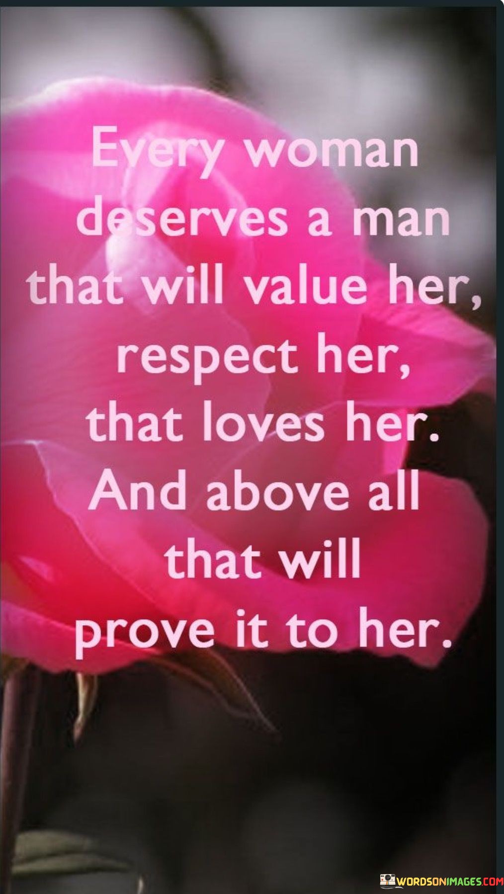 his quote emphasizes the importance of having a partner who genuinely values and respects a woman. It suggests that every woman deserves a man who not only loves her but also demonstrates that love through actions and behavior. Value her" highlights the significance of recognizing a woman's worth, appreciating her qualities, and cherishing her presence in the relationship.