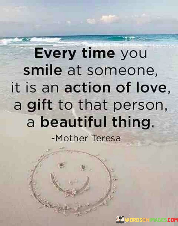 This quote acknowledges that each smile we share with someone is an expression of love and a gift to them. It suggests that the act of smiling holds a deep and meaningful significance, representing our genuine care and kindness.