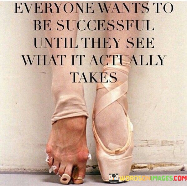 The phrase "Everyone wants to be successful until they see what it actually takes" succinctly conveys the contrast between the aspiration for success and the realization of the effort required.