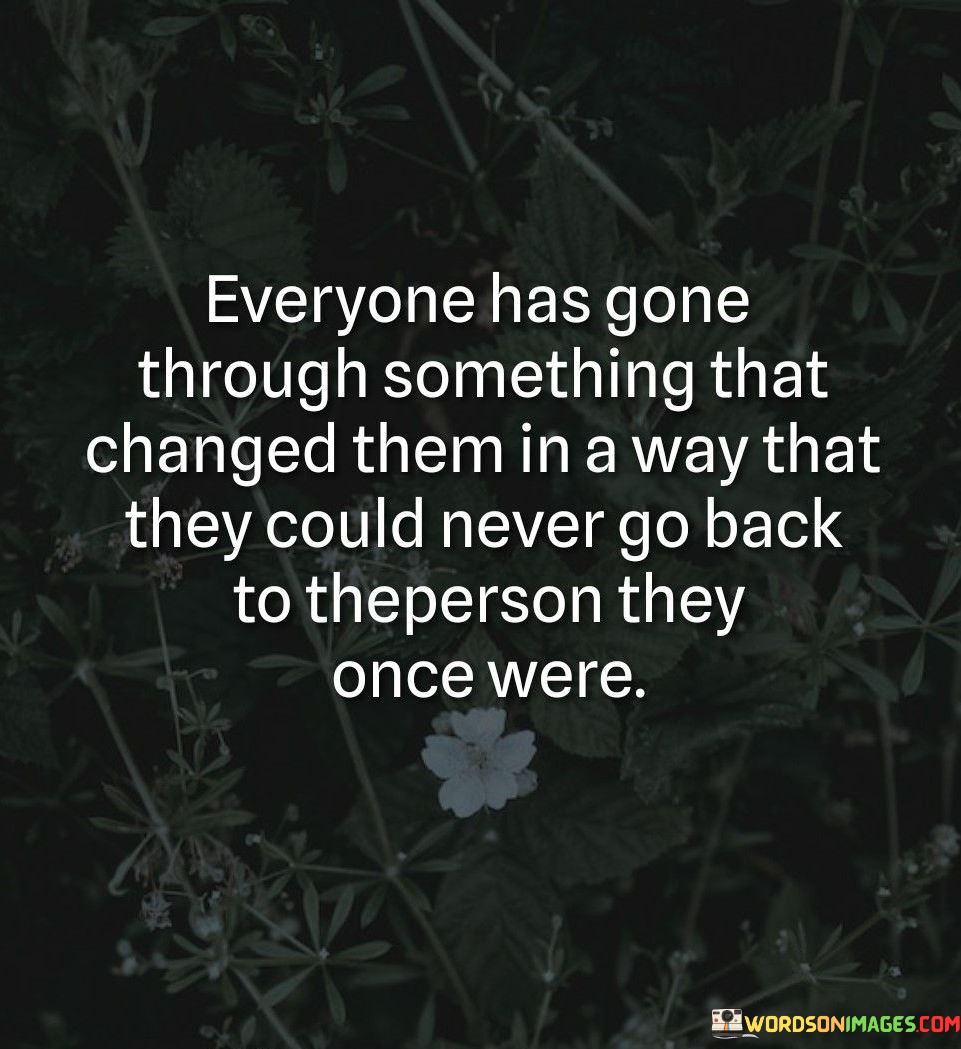 This quote delves into the transformative nature of personal experiences and how they shape individual growth and development. In the first paragraph, "everyone has gone through something that changed them," it acknowledges that life is full of impactful events that alter perspectives, beliefs, and behaviors. These experiences often bring about profound shifts in a person's understanding of themselves and the world.