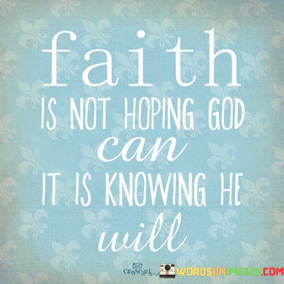 The quote "Faith Is Not Hoping God Can, It Is Knowing He Will" highlights a profound understanding of faith as a deep and unwavering trust in God's ability and willingness to fulfill His promises and work in one's life.