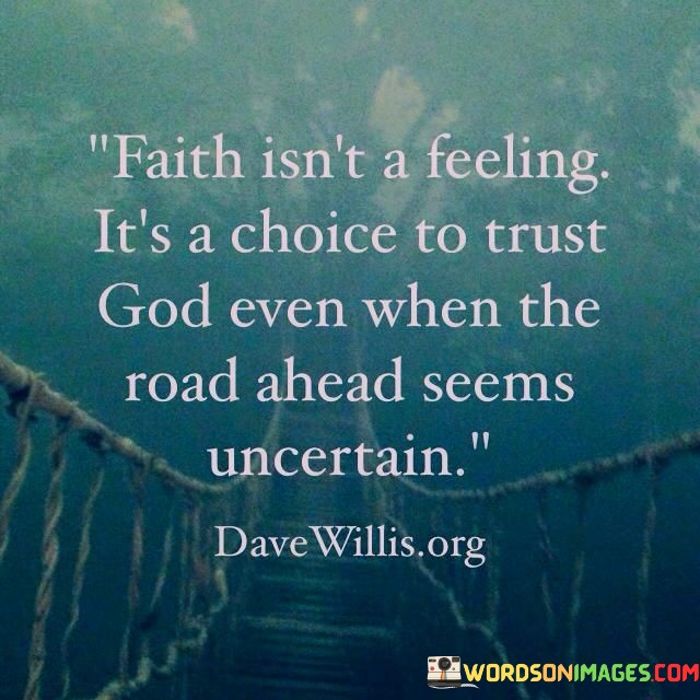 In essence, "Faith Isn't A Feeling, It's A Choice To Trust God Even When The Road Ahead Seems Uncertain" highlights the active and intentional aspect of faith, reminding believers that they can choose to trust God's plan and seek His guidance, even in the midst of life's uncertainties.
