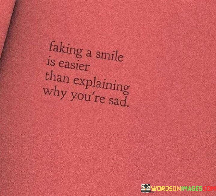 The quote reflects the struggle of concealing emotions. "Faking a smile" refers to putting on a facade. "Easier than explaining why you are sad" implies the challenge of articulating feelings. It highlights the social pressure to present a positive front rather than delving into personal struggles.