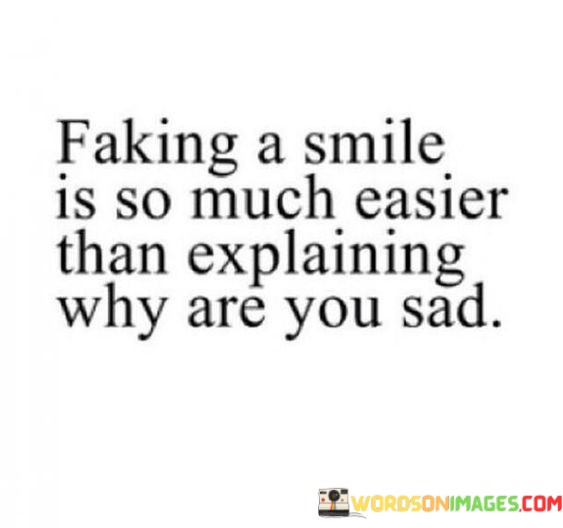The quote highlights the complexities of emotions. "Faking a smile" implies masking feelings. "Easier than explaining why you are sad" underscores the difficulty of opening up. The quote conveys the challenges of verbalizing deep emotions and the simplicity of concealing them.
