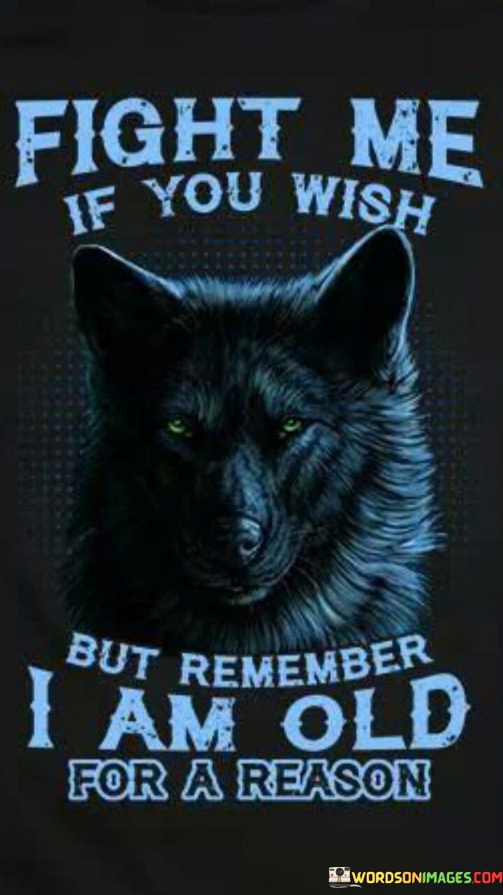 The quote "Fight me if you wish, but remember I am old for a reason" conveys a powerful message about the wisdom and experience that come with age. When someone says, "Fight me if you wish," they are acknowledging that they are not afraid of confrontation or challenges. They are open to standing up for their beliefs, defending their principles, and confronting opposition if necessary. However, the second part of the quote, "but remember I am old for a reason," adds depth and meaning to the statement. It implies that the person has lived a long life and has gathered valuable experiences and knowledge along the way. It suggests that their age has granted them insights, lessons, and perspectives that are not easily understood or appreciated by younger individuals. The phrase serves as a reminder that age often brings wisdom, understanding, and a broader outlook on life. It suggests that the older person may have learned from their mistakes, overcome challenges, and gained valuable insights that have shaped their character and decisions. In this context, the quote can be seen as a gentle warning to others not to underestimate the wisdom and resilience of the older person. It serves as a reminder that age should be respected and honored, as it often brings a deeper understanding of life's complexities. Moreover, the quote might also imply that engaging in unnecessary conflicts or arguments is unwise, as the older person may have learned the importance of choosing battles wisely and finding peaceful resolutions whenever possible. Overall, the quote "Fight me if you wish, but remember I am old for a reason" carries a profound message about the value of age and experience. It encourages respect for the wisdom and insights that come with living a long life and serves as a reminder to approach conflicts with thoughtfulness and consideration.