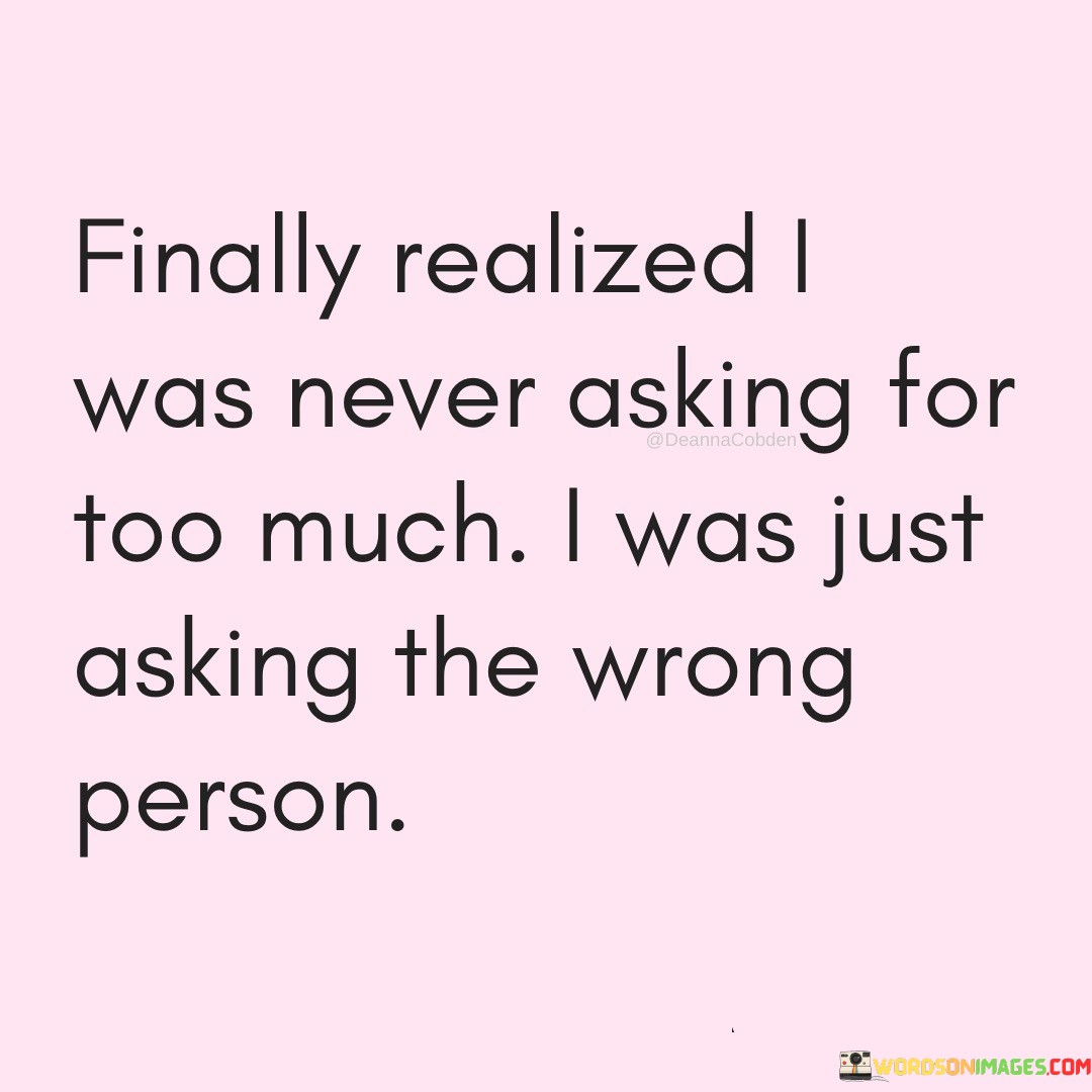 The quote signifies a realization of misplaced expectations. "Never asking for too much" reflects reasonable desires. "Asking the wrong person" implies the mismatch of expectations and the individual's capability to fulfill them. The quote emphasizes the significance of finding the right connection.
