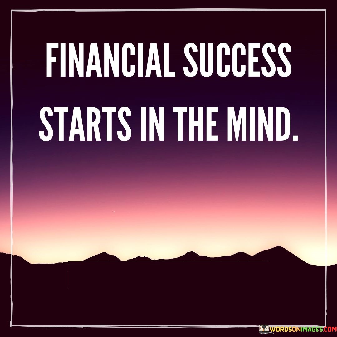 The phrase "Financial success starts in the mind" succinctly conveys the notion that one's mindset and beliefs play a pivotal role in achieving financial prosperity.