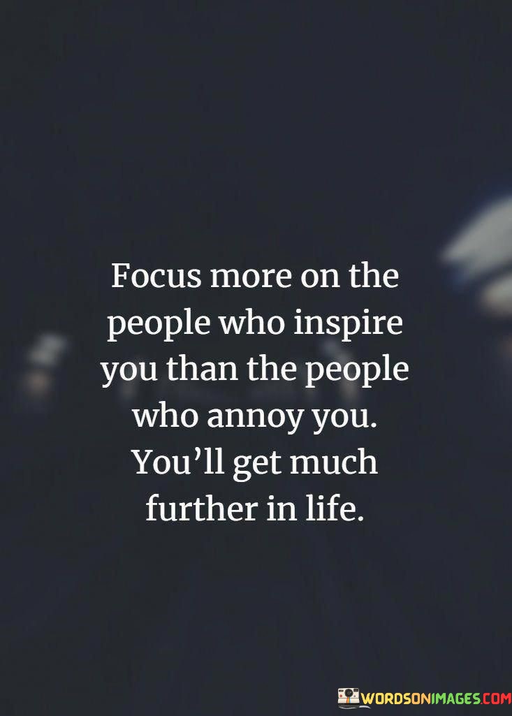 The quote "Focus more on the people who inspire you than the people who annoy you; you'll get much further in life" underscores the significance of surrounding oneself with positive influences for personal growth and success.