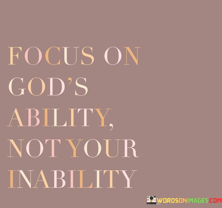 In essence, "Focus on God's ability, not your inability" serves as a reminder to place one's trust in a higher power, recognizing that with faith and reliance on God's strength, individuals can overcome their perceived limitations and achieve what they may have thought was beyond their capabilities. It underscores the importance of faith and confidence in the face of challenges.
