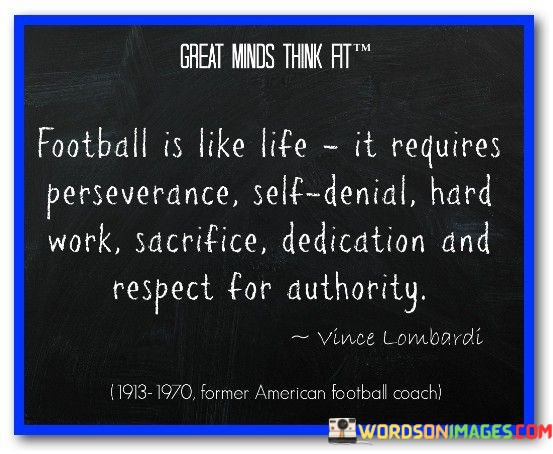 In essence, the quote beautifully draws parallels between the qualities that contribute to success in football and the qualities that are crucial for leading a fulfilling and accomplished life. It underscores the idea that the principles learned and honed on the football field can be applied to various aspects of life to achieve personal growth and excellence.