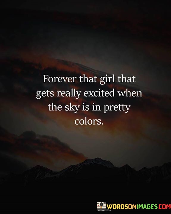 This quote captures the essence of a person who remains forever youthful and enthusiastic, finding joy in the simple beauty of nature. The phrase "forever that girl" suggests a timeless quality, indicating that this individual's childlike wonder and excitement endure throughout their life. The specific trigger for their excitement is "when the sky is in pretty colors," referring to the magical moments during sunrise or sunset when the sky is painted with vibrant hues. The person described in the quote is portrayed as someone who appreciates the small wonders of life, particularly the captivating transformation of the sky. Their genuine enthusiasm reflects a pure and unyielding sense of delight in the world's natural wonders, reminding us of the importance of cherishing and finding joy in the little things that often go unnoticed amidst the hustle and bustle of daily life. This quote serves as a gentle reminder to stay connected to the awe-inspiring beauty of the world around us and to approach life with a heart full of childlike wonder, even as we grow older.