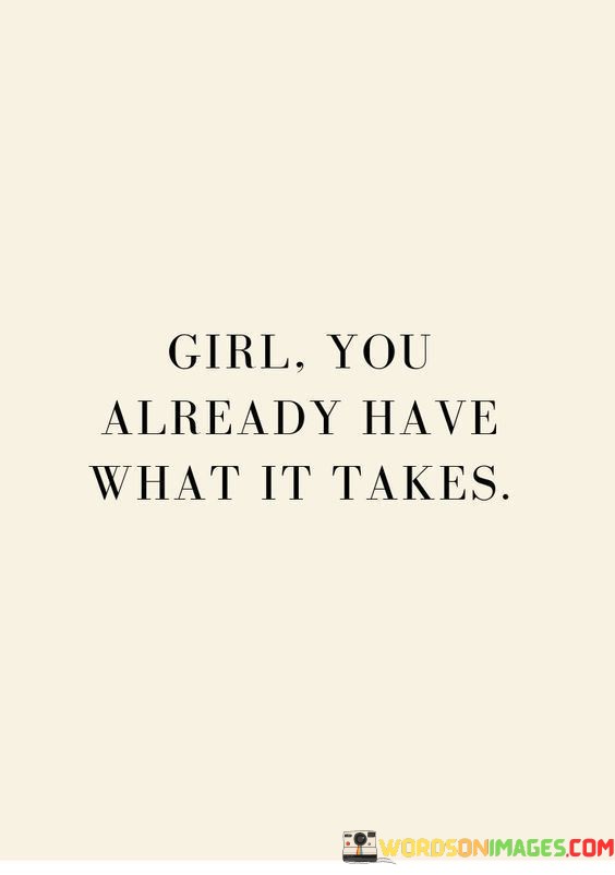 You, as a girl, already possess all the qualities and abilities needed for success. This quote emphasizes the idea that you don't need to search outside yourself for what it takes to achieve your goals; it's already within you. It's like having a treasure chest of skills and potential waiting to be unlocked.