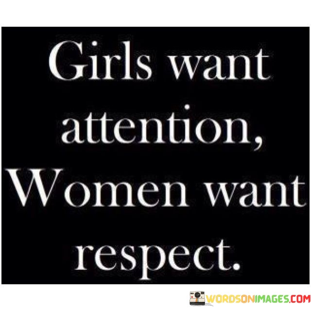 The quote delves into the evolution of desires and expectations as girls mature into women. It subtly underscores the importance of acknowledging the distinctions between wanting attention and seeking respect in human interactions. It urges us to recognize that women, as they grow older, place greater emphasis on the value they bring to relationships and the importance of being treated with respect and equality. It also prompts us to reflect on the impact of societal expectations on girls and women, encouraging us to foster a culture that promotes self-worth and self-respect rather than seeking validation solely through external attention. Ultimately, the quote serves as a reminder to treat women with the respect they deserve, acknowledging their unique contributions and appreciating them for their qualities, talents, and accomplishments. It encourages us to create spaces where women can thrive, be celebrated, and be valued for the individuals they are, without the need for superficial attention-seeking behaviors.