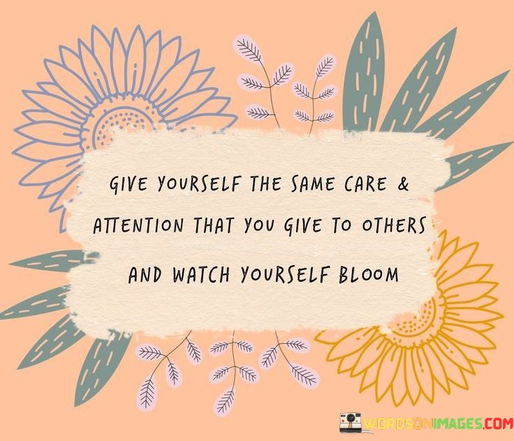 Ultimately, the quote promotes the idea of personal transformation through self-care. It implies that by providing oneself with the same care and attention shown to others, individuals can experience positive growth and development. By highlighting the relationship between self-care and personal blooming, the quote guides individuals towards fostering a healthy and fulfilling relationship with themselves.