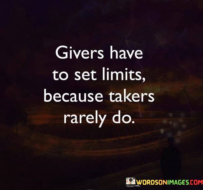 The statement promotes the idea of maintaining a balanced dynamic in relationships. It implies that givers, who often prioritize the needs of others, must also prioritize their own well-being by setting boundaries. By recognizing the value of establishing limits, individuals can create healthier interactions and avoid being taken advantage of.