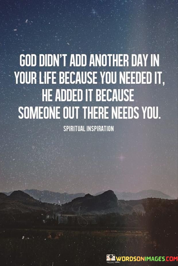 This quote reflects the idea that each day we are given is not just for our own benefit but also to fulfill a purpose in the lives of others. It implies that God extends our time on Earth because there are people who rely on our presence, support, or contributions.