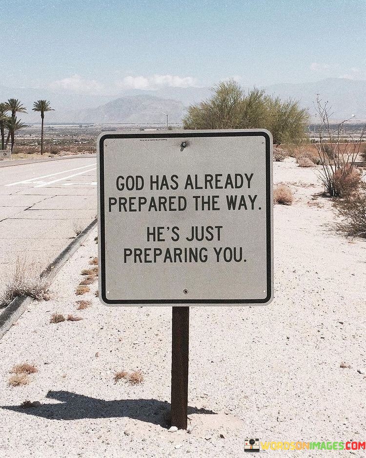 The quote "God Has Already Prepared The Way, He's Just Preparing You" conveys a message of faith and trust in God's divine plan and timing. It suggests that while God has already arranged a path or plan for individuals, He is also actively working on preparing them for the journey ahead.