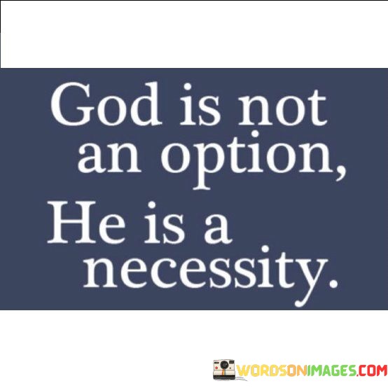 The statement "God Is Not An Option, He Is A Necessity" conveys a message of the fundamental importance of God and spirituality in one's life. It emphasizes the belief that God is not merely a choice or a preference but an essential and indispensable part of a fulfilling and meaningful life.