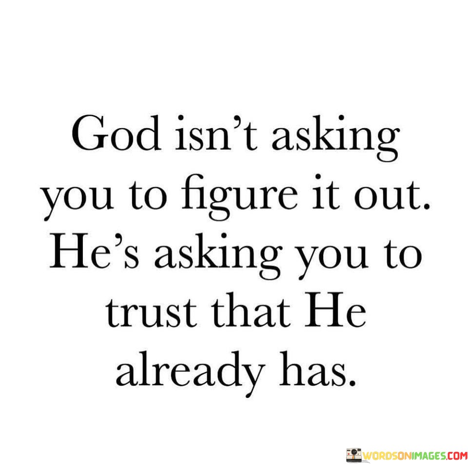 In essence, "God isn't asking you to figure it out; He's asking you to trust that He already has" underscores the value of faith and reliance on a higher power. It signifies the belief that God's plan is perfect and that trusting in His guidance can lead to a more fulfilling and purposeful life.
