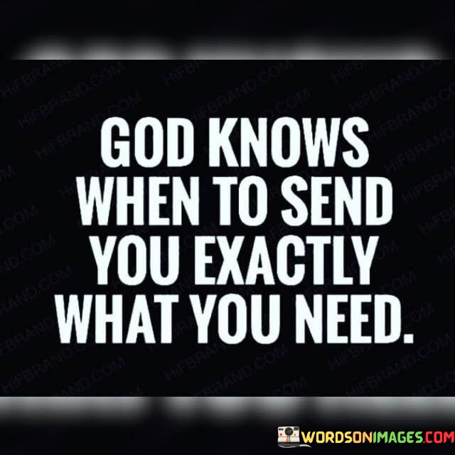 This quote conveys the idea that God possesses perfect timing and provides individuals with what they need precisely when they need it. In a single sentence, it suggests that God has the wisdom to send the right things or people into one's life at the perfect moment.