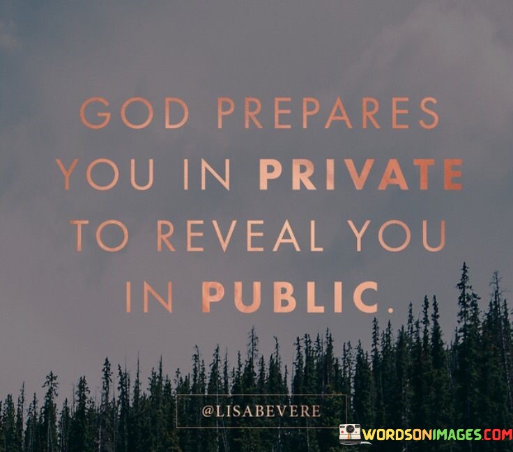 This quote conveys the idea that God often works behind the scenes, shaping and molding individuals in their private moments, developing their character, skills, and faith. These private preparations are essential for the eventual revelation of one's potential, gifts, or calling in a public or more prominent capacity.