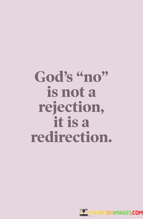 The quote, "God's no is not a rejection; it is a redirection," imparts a message of faith, resilience, and trust in a higher power's plan.