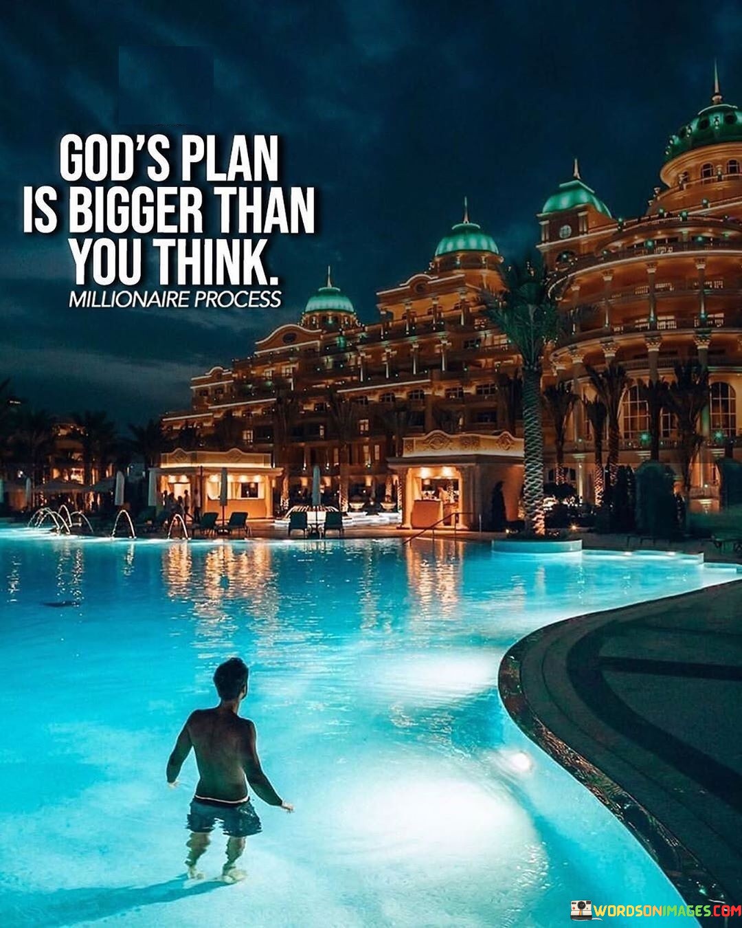 This quote conveys a message of trust and humility in relation to God's divine plan. It suggests that God's plan for an individual's life is grander and more significant than what they may perceive or understand.