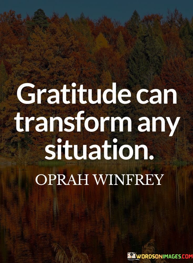 "Gratitude Can Transform Any Situation" encapsulates the idea that focusing on what one is thankful for can lead to a more positive outlook. It implies that gratitude has the ability to shift one's mindset. The phrase underscores the importance of cultivating a thankful mindset.