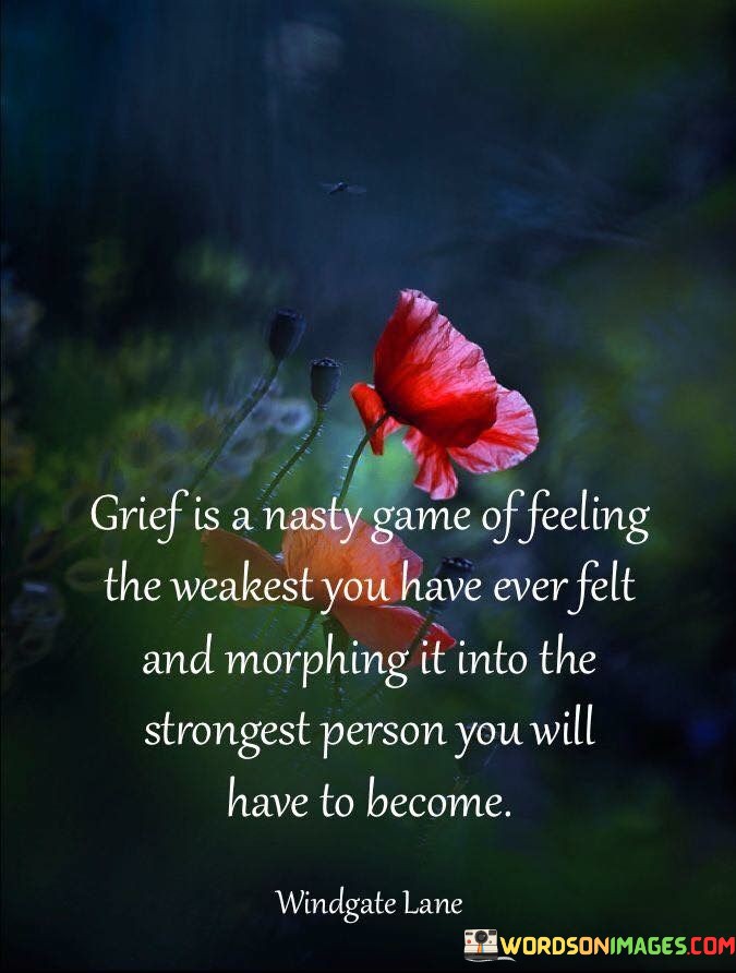 The quote highlights the transformative power of grief. "Feeling the weakest you have ever felt" signifies vulnerability. "Morphing it into the strongest person" reflects resilience. The quote conveys the process of channeling pain into personal growth and strength.