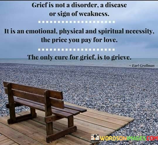 This quote addresses the nature of grief. It emphasizes that grief is not a disorder, disease, or a sign of weakness. Instead, it's portrayed as a necessary part of the human experience, involving emotions, physical sensations, and spiritual aspects. It's described as the price one pays for love, acknowledging that the depth of grief often corresponds to the depth of love one had for the person or thing they've lost.