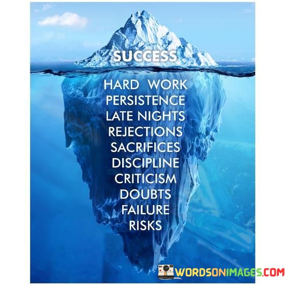 The quote encompasses the multifaceted journey to success. It acknowledges that achieving one's goals involves hard work, persistence, and late nights. It embraces challenges like rejections, sacrifices, and doubts, highlighting the importance of discipline. The mention of criticism, failure, and risks reflects the reality of striving for success amid obstacles and uncertainties.