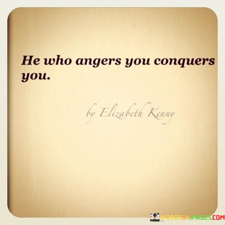 This quote underscores the profound impact of anger on one's well-being. Allowing anger to control you gives power to the source of your irritation. Reacting with rage cedes emotional control, leading to unfavorable outcomes and potential manipulation by others, as they dictate your responses and influence your actions.