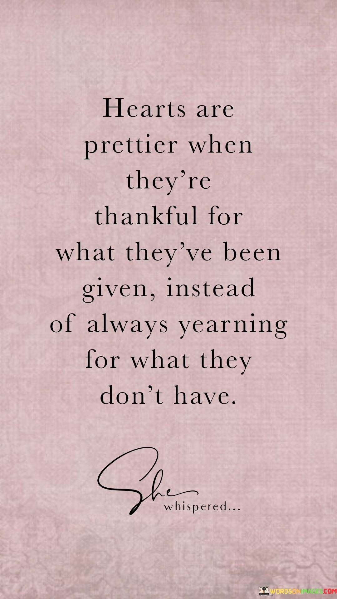 "Hearts Are Prettier When They're Thankful For What They've Been Given Instead of Always Yearning for What They Don't Have" captures the essence of a grateful perspective. It suggests that the radiance of a heart lies in its ability to find joy in the present moment and to appreciate the abundance already present. The quote reflects the idea that gratitude enhances inner beauty and reflects on one's outward demeanor.