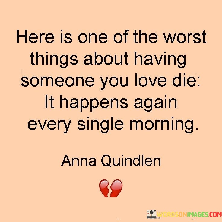 The quote captures the enduring pain of losing a loved one, emphasizing that the grief and the realization of their absence resurface each morning.