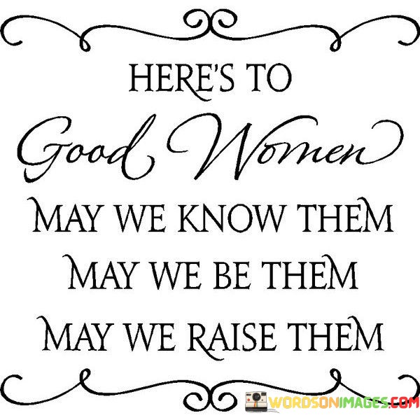 The quote "Here's to good women: may we know them, may we be them, may we raise them" is a heartfelt tribute to the strength, impact, and potential of women. It celebrates the profound influence of remarkable women in our lives and acknowledges the roles we play in shaping and empowering the next generation of women.The first part of the quote, "may we know them," encourages the recognition and appreciation of the good women who have made a positive difference in our lives. It urges us to be mindful of the extraordinary women around us—those who have been sources of inspiration, support, and wisdom. By acknowledging their contributions, we honor their accomplishments and the transformative effect they have had on us.The second part, "may we be them," serves as a call to action and empowerment. It encourages each person, regardless of gender, to embody the qualities and values exhibited by these good women. It invites us to cultivate the same strength, resilience, compassion, and integrity in our own lives, following in their footsteps and continuing their legacy.The third and final part, "may we raise them," highlights the importance of nurturing the next generation of women. It recognizes the role of parents, guardians, and mentors in fostering an environment where young girls can grow into strong, confident, and empowered individuals. By raising and supporting young women, we contribute to a future where they can fulfill their potential and make a positive impact on the world.In essence, the quote embodies a beautiful sentiment of admiration, empowerment, and responsibility. It celebrates the power of women's influence, calls for personal growth and development, and reminds us of our duty to uplift and empower the women of the future. It is a tribute to the resilience and potential of women and an inspiration to create a world where all women can thrive.