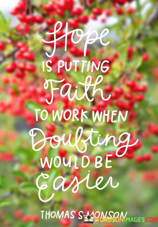 The phrase "putting faith to work" signifies the proactive and determined nature of hope. It implies that hope involves taking deliberate steps and making conscious efforts to believe in positive outcomes, even when doubt or pessimism may seem like the easier path.