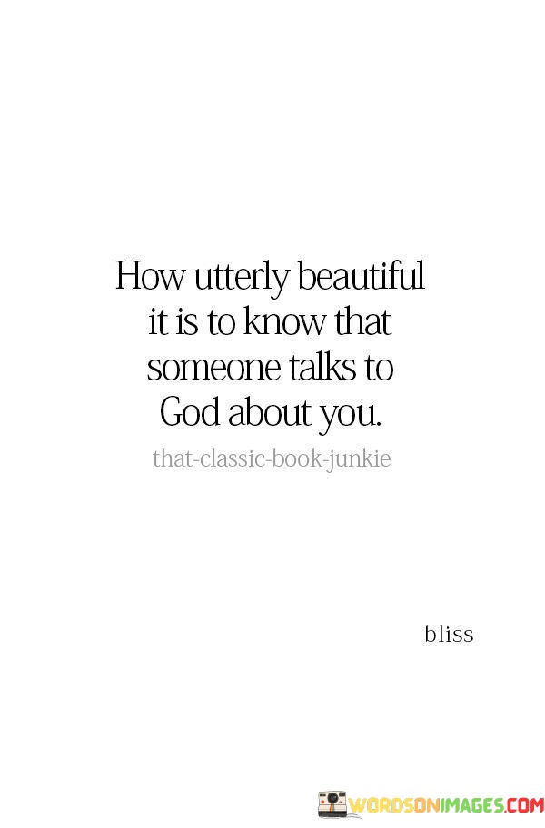 This quote conveys a sense of profound beauty and comfort in the knowledge that someone cares for you to the extent that they include you in their prayers and conversations with God.